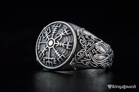 Vegvisir Viking Symbol Ring with Viking Style Ornament Sterling Silver Jewelry