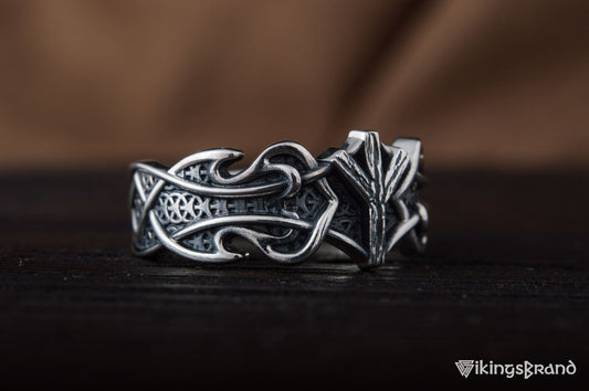 Vikings Ring with Algiz Rune and Norse Ornament Sterling Silver Viking Jewelry