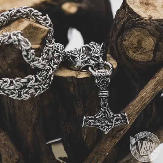 HANDMADE Stainless Steel Massive Wolf Chain with Mjolnir