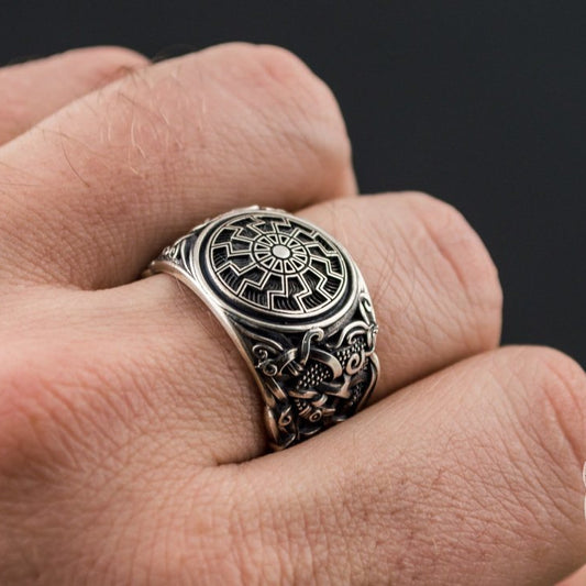 Ornamental Black Sun 925 Sterling Silver Viking Ring