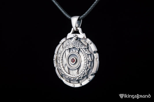 Shield with Vikings Ouroboros Symbol Pendant and Gem Sterling Silver Norse Jewelry