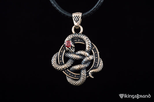 Vikings Snake Pendant with Runes and Red Cubic Zirconia Bronze Norse Jewelry