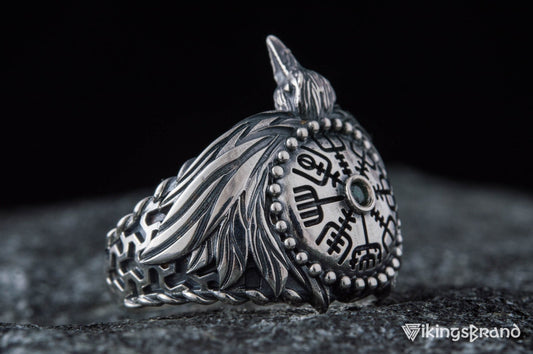 Odin Viking Raven Ring with Vegvisir Symbol Sterling Silver Norse Jewelry