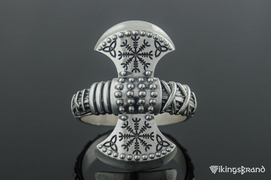 Vikings Axe Ring with Helm of Awe Symbol Sterling Silver Viking Jewelry