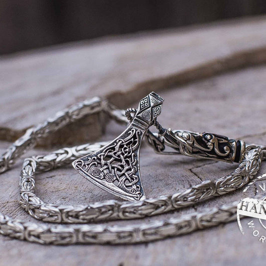 Set of Sterling Silver Square Viking Chain with Wolf Tips and Viking Axe Pendant