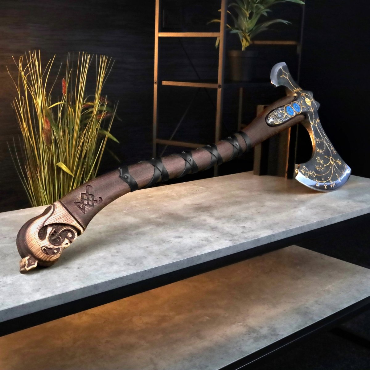 Another version of our "Leviathan Kratos" axe (v 2.0) from God of War. This beautiful handmade heavy axe comes with a custom-made wooden handle with leather wraps. The blade is forged of high carbon steel and comes with a free leather cover. It's a perfect choice if you wish to decorate your home in a Viking style or take it to a LARP game.