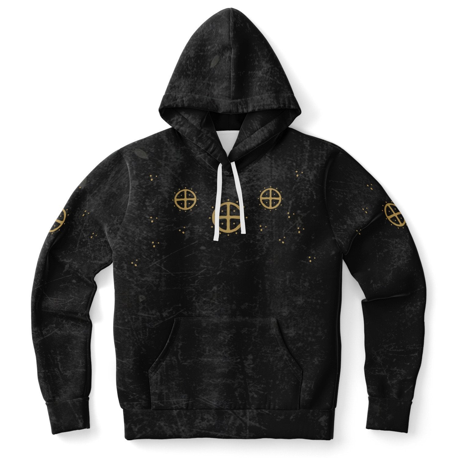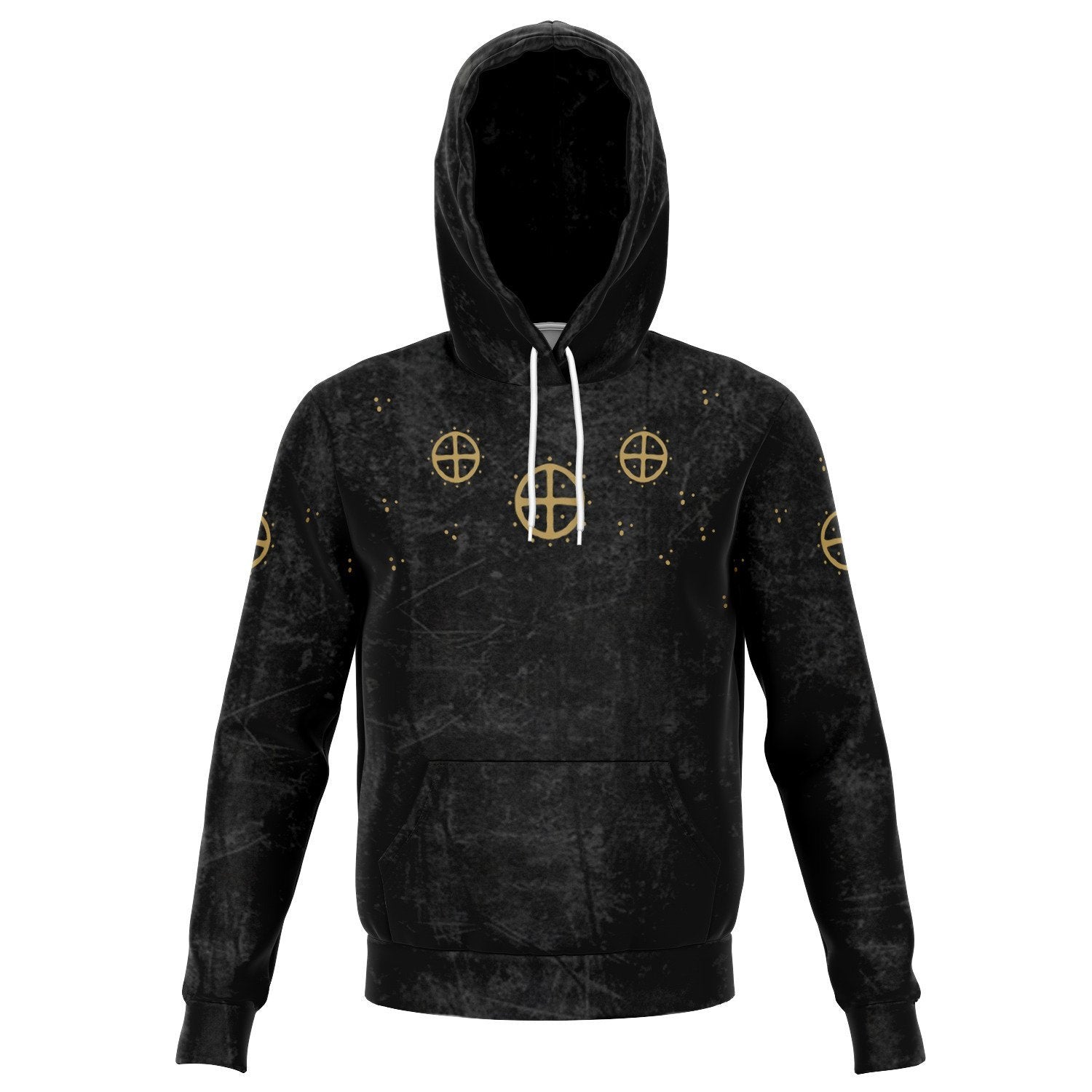 It was long foretold in Viking legend that Fenrir, wolf-son of the god Loki, would devour Odin during Ragnarök. Show the world the real legend of Ragnarök by wearing this Viking hoodie depicting Odin's crosses and Fenrir's vicious grin over a Viking helmet. That way, you become part of the legend!