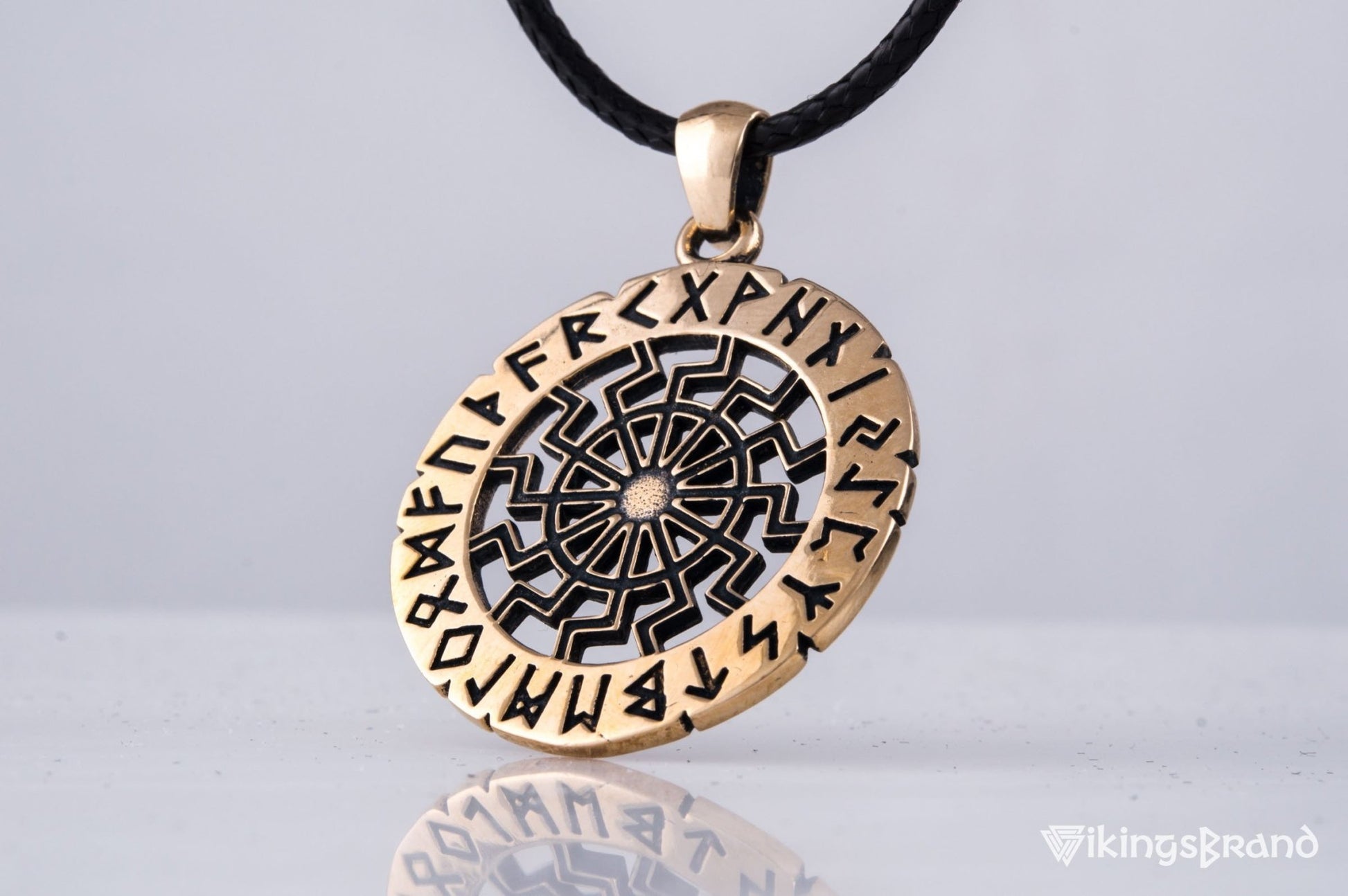 Vikings Black Sun Symbol with Elder Futhark Runes Bronze Pendant