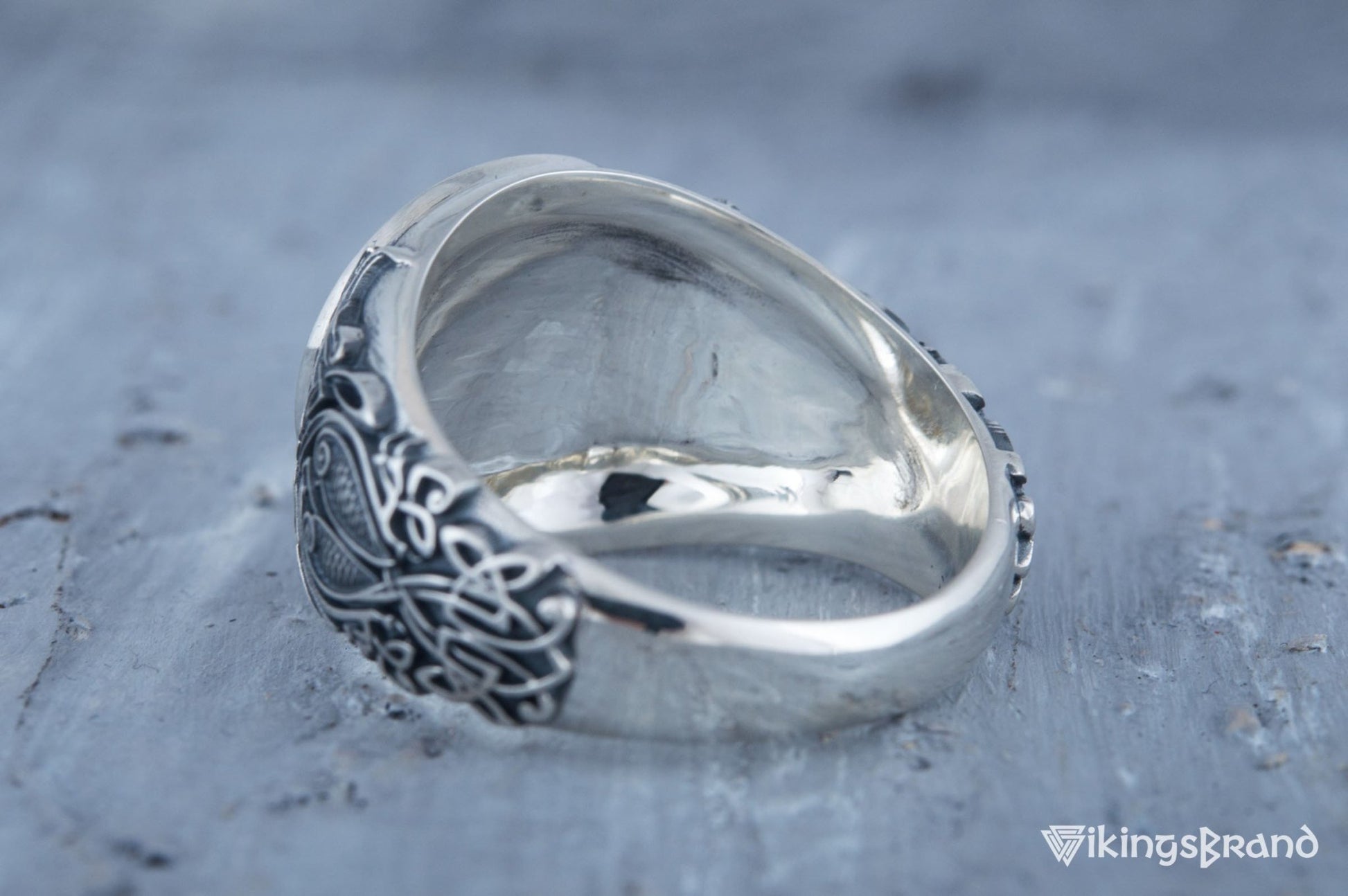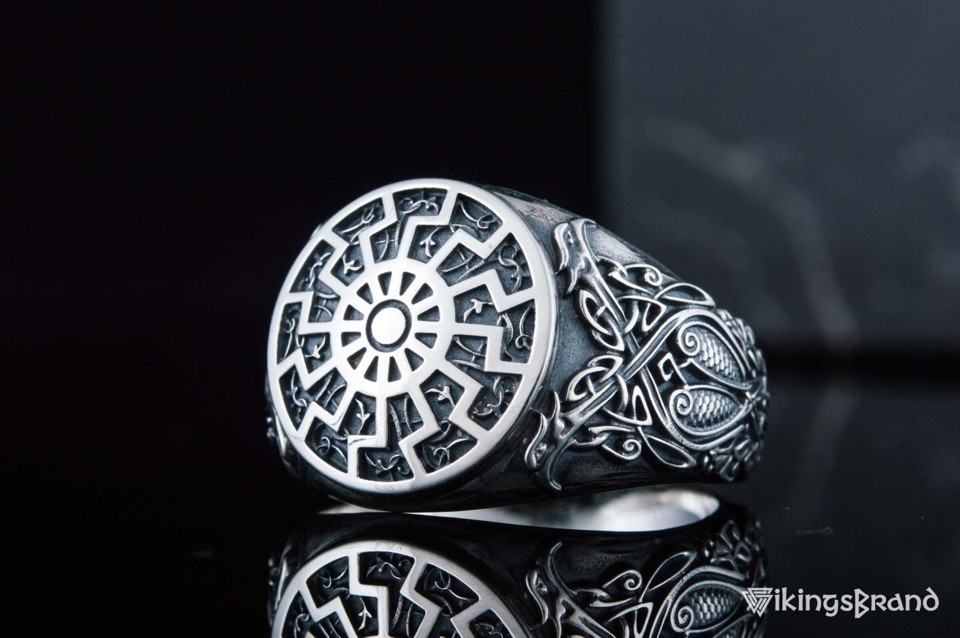 Black Sun Viking Symbol Ring with Viking Style Ornament Sterling Silver Jewelry