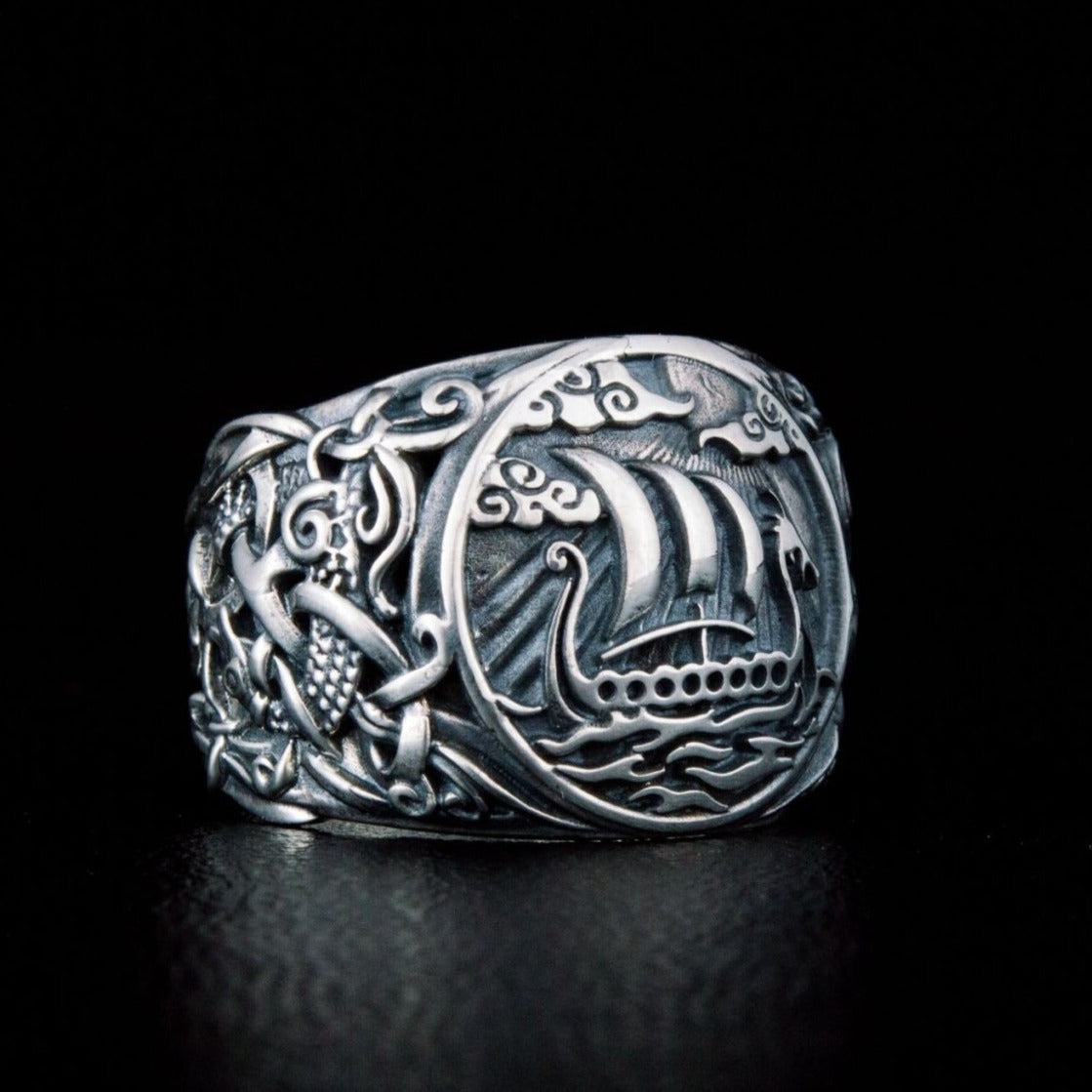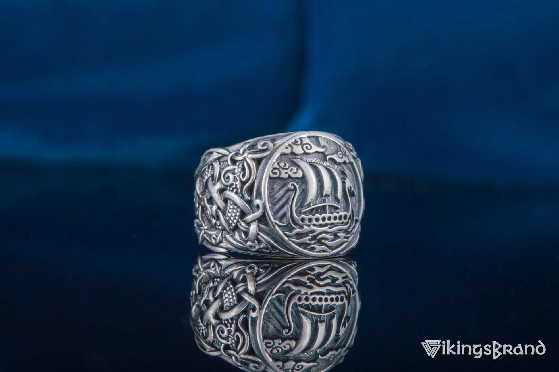 Drakkar Viking Symbol Ring with Mammen Ornament Gold or Sterling Silver Viking Jewelry