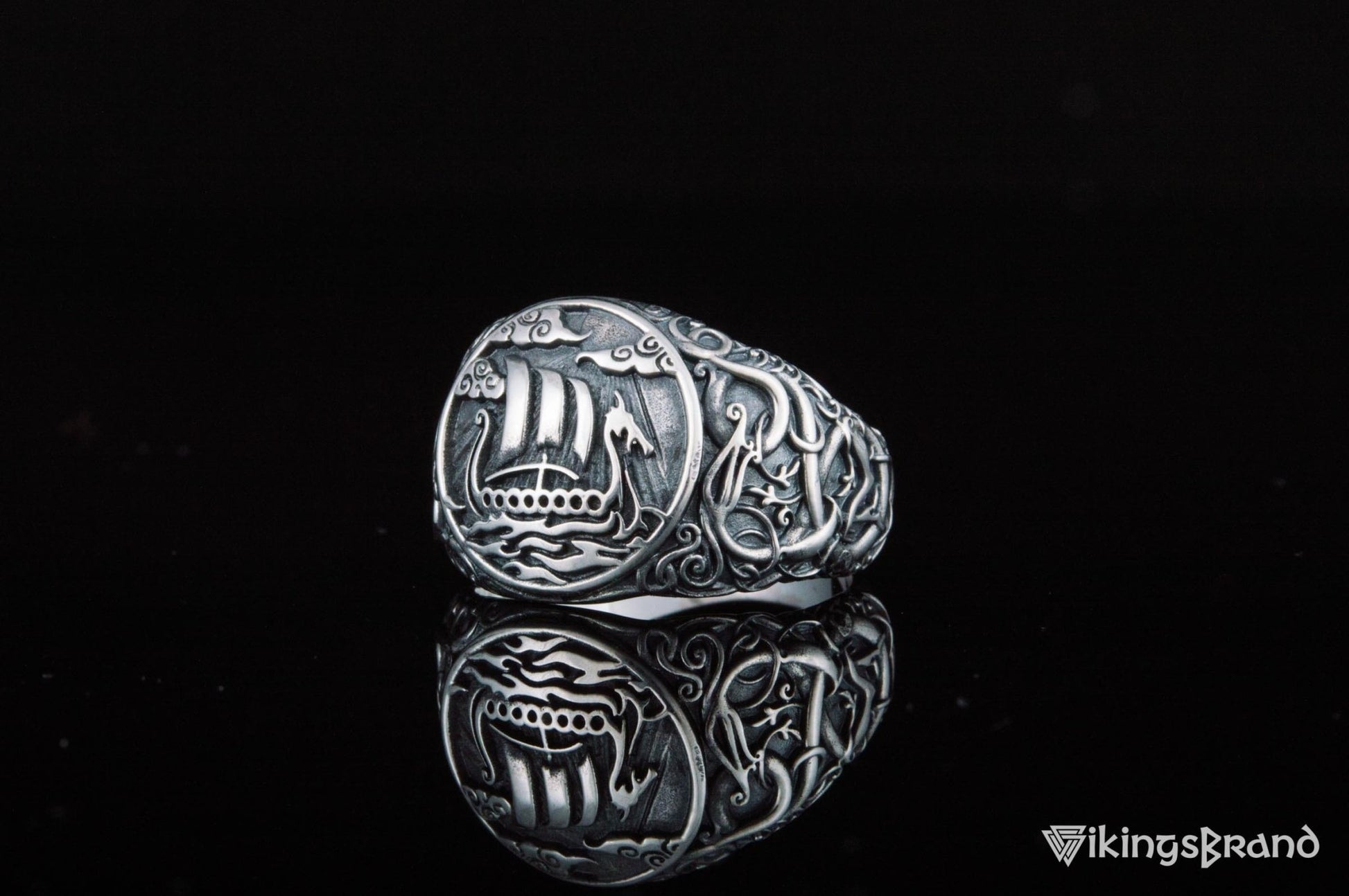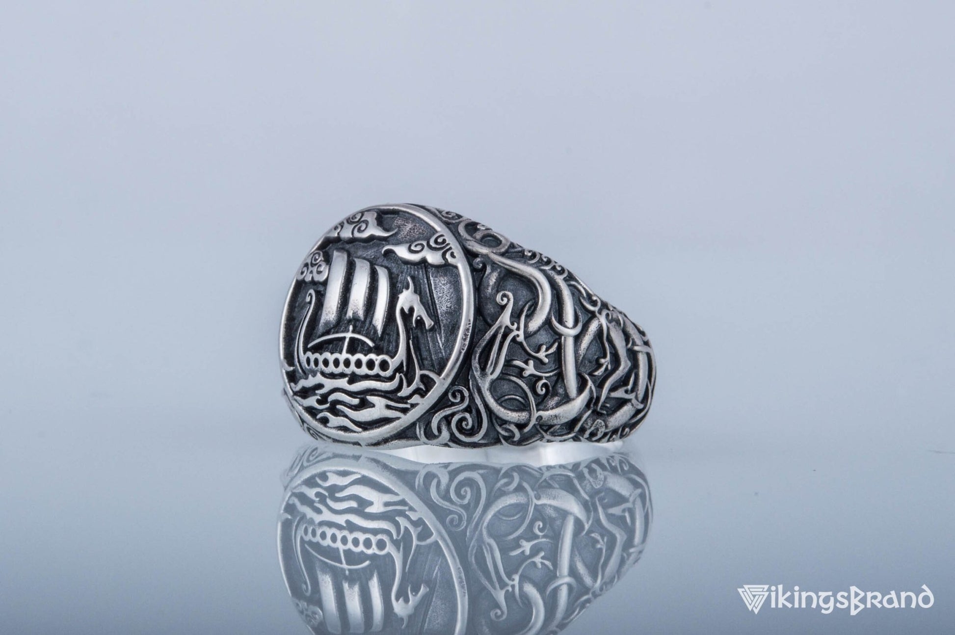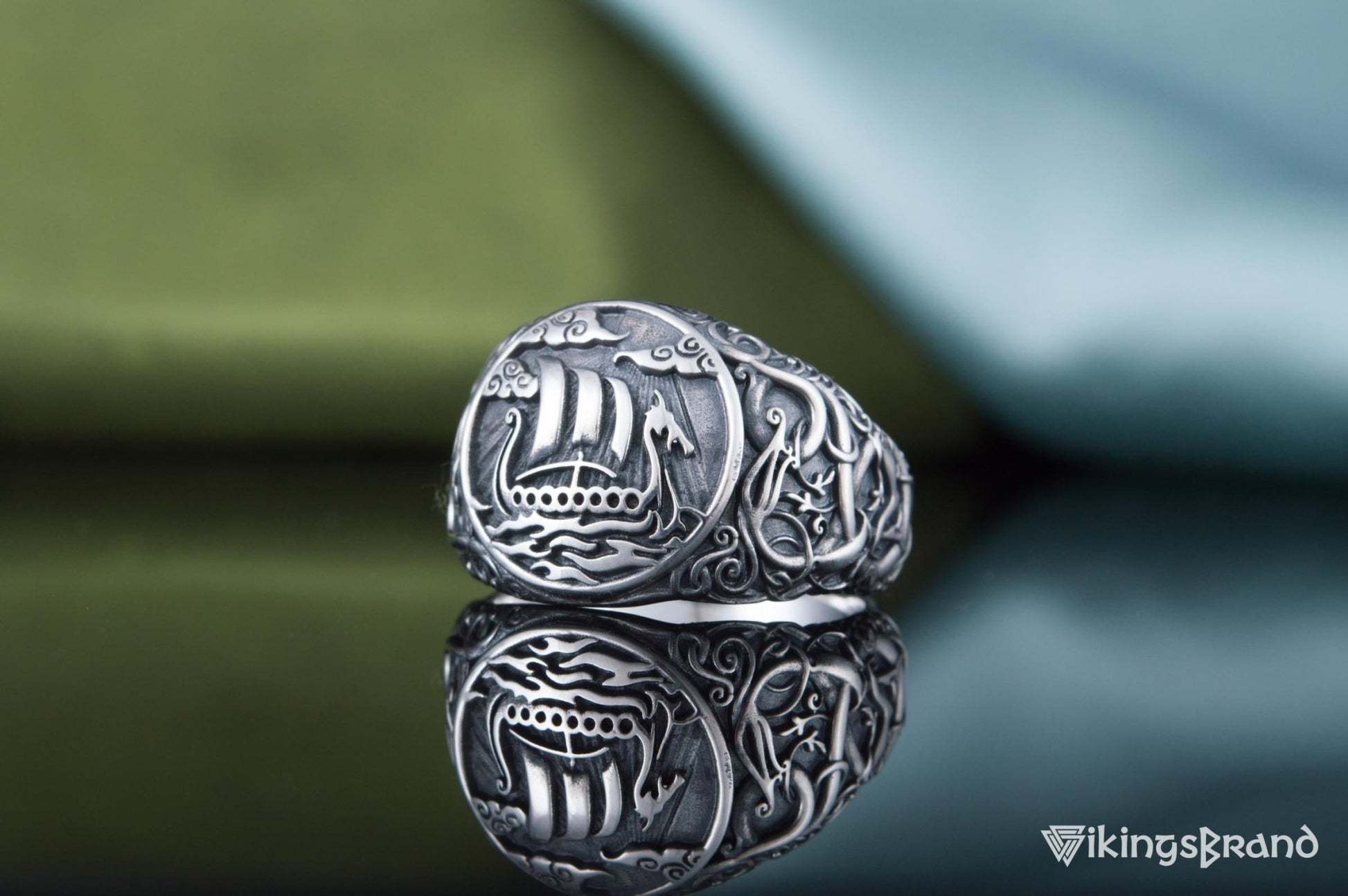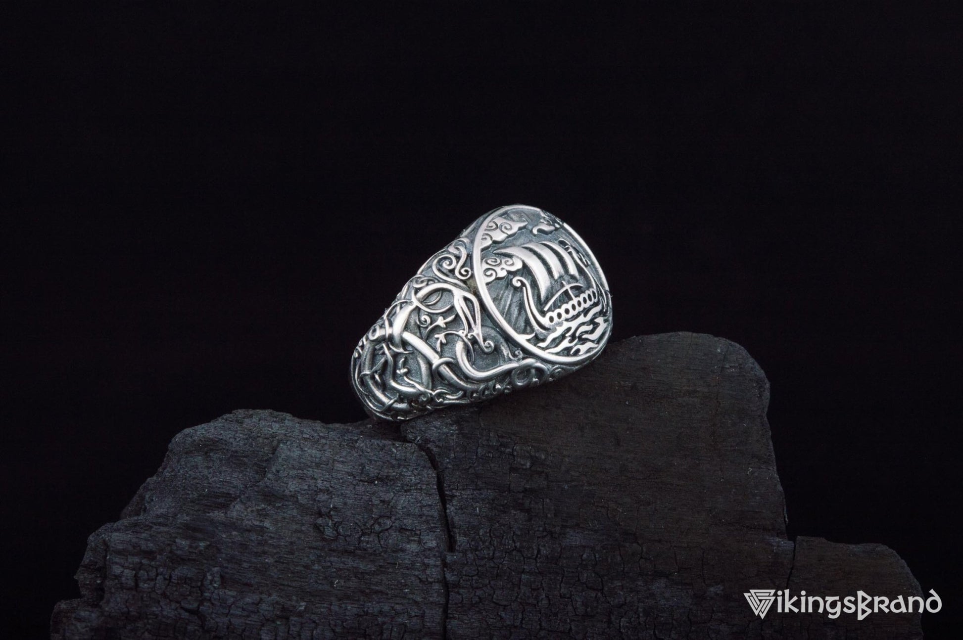 Drakkar Viking Symbol Ring with Urnes Style Sterling Silver Viking Jewelry