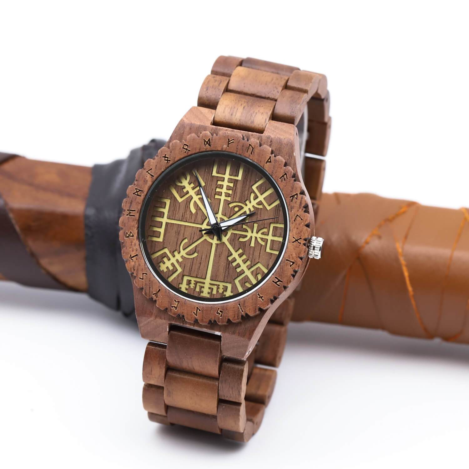 Halfdan Viking Wooden Watch with Carved Vegvisir Viking Compass & Custom Engravings!