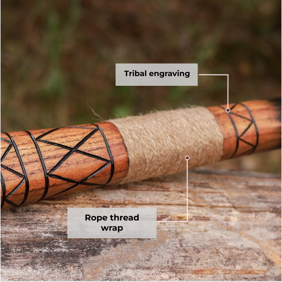 Forged from high-carbon steel W108, this tomahawk is built to last. The ash wood handle, wrapped with durable rope threading, provides a secure and comfortable grip while adding a rustic, handcrafted aesthetic. The handle’s blackened section gives it a distinctive look and serves as a perfect space for custom personalization.