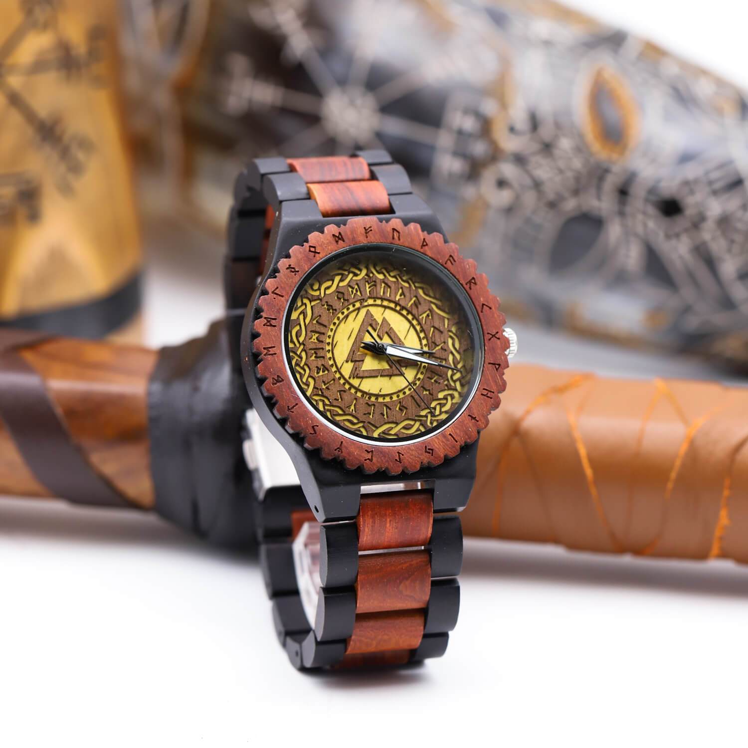 Harald Viking Wooden Watch with Carved Valknut Viking Symbol & Custom Engravings!