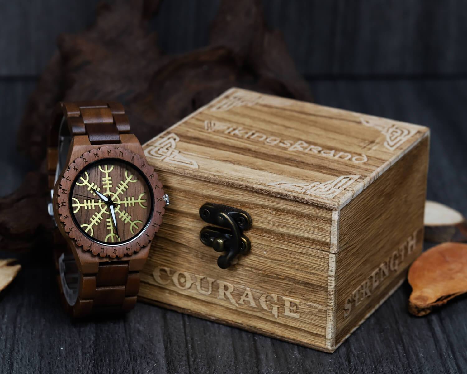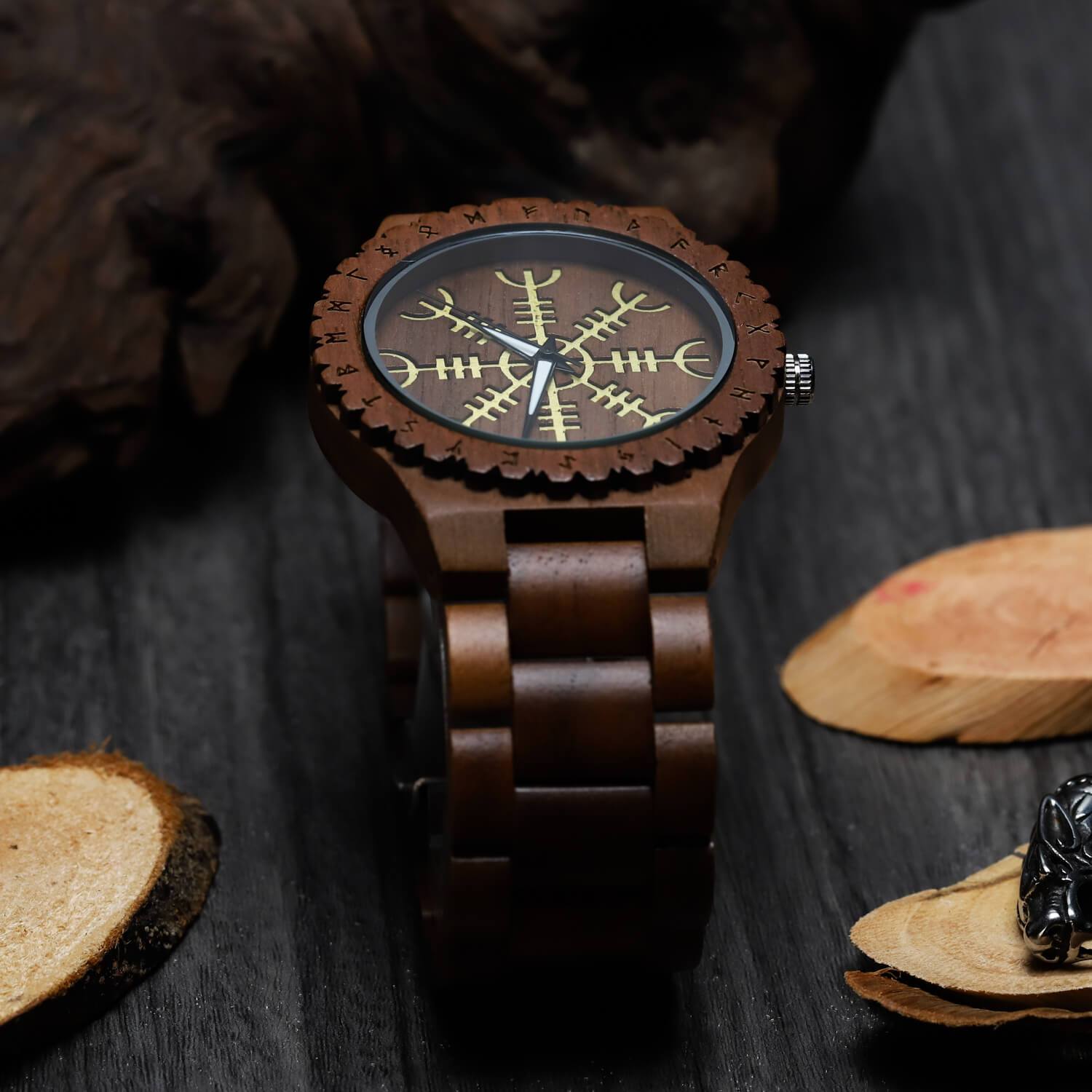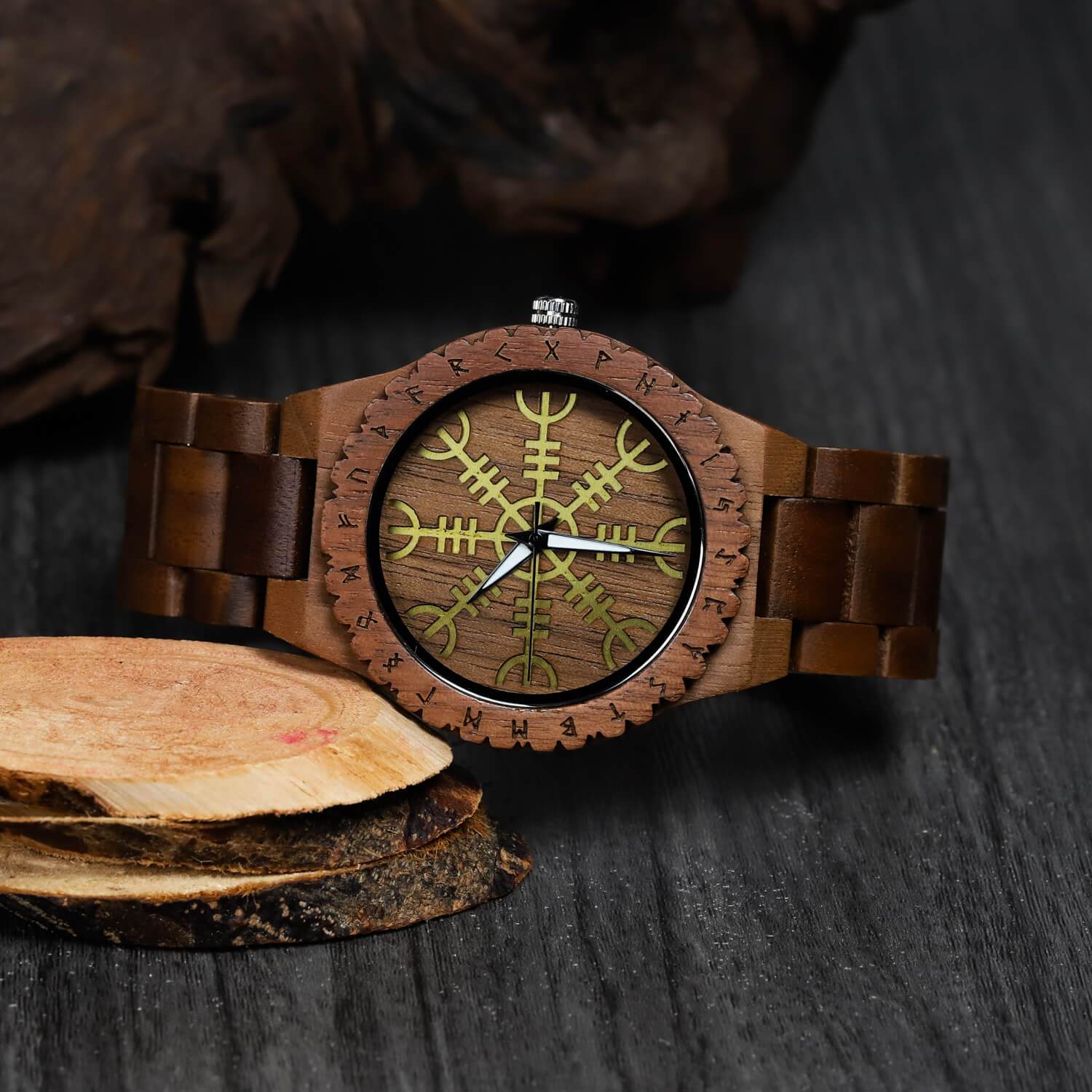 Ulfhild Viking Wooden Watch with Carved Helm of Awe Viking Symbol & Custom Engravings!