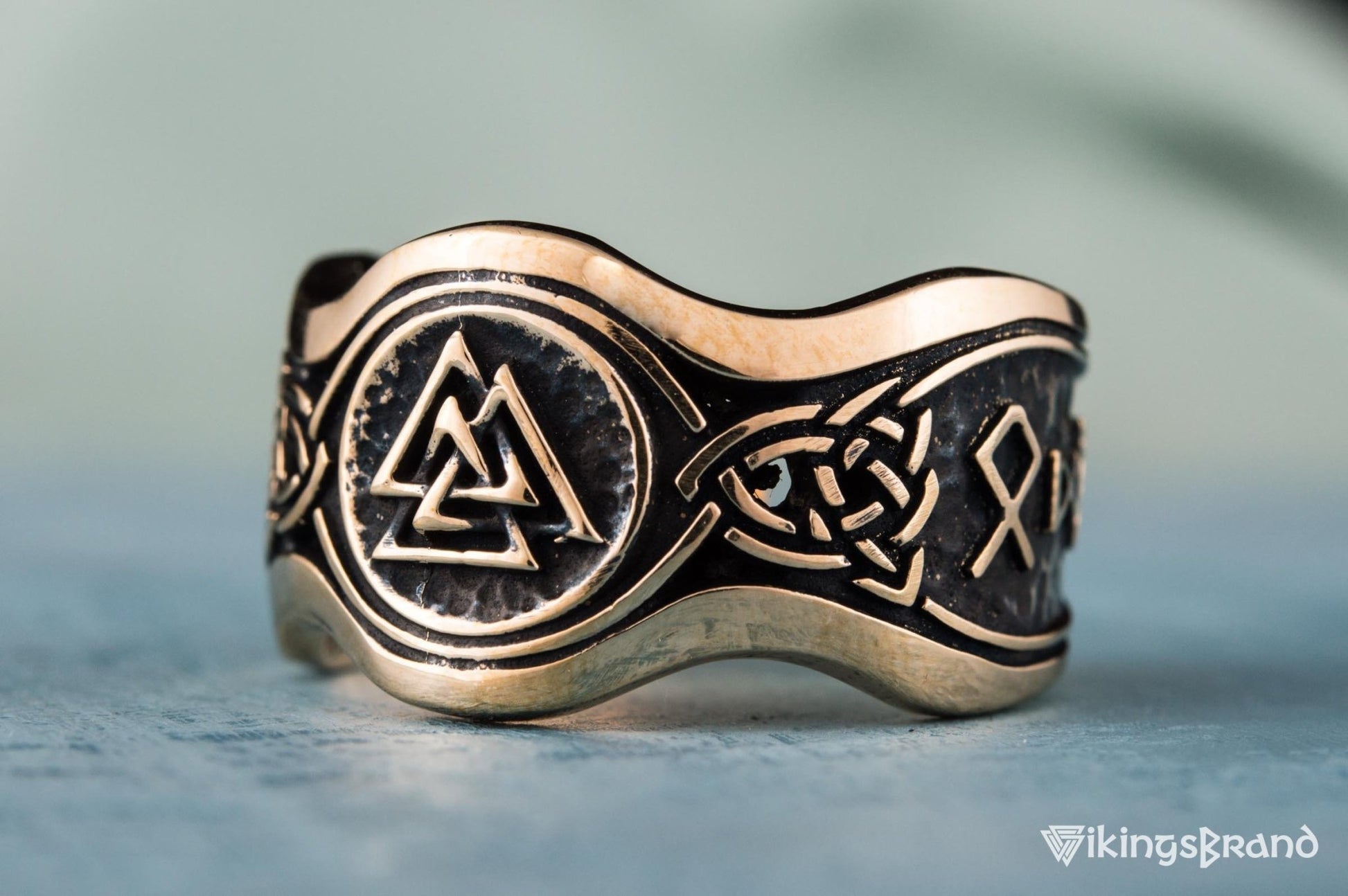 Valknut Viking Symbol With HAIL ODIN Runes Bronze Viking Ring