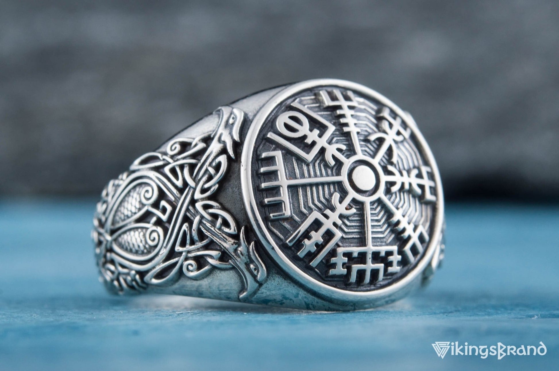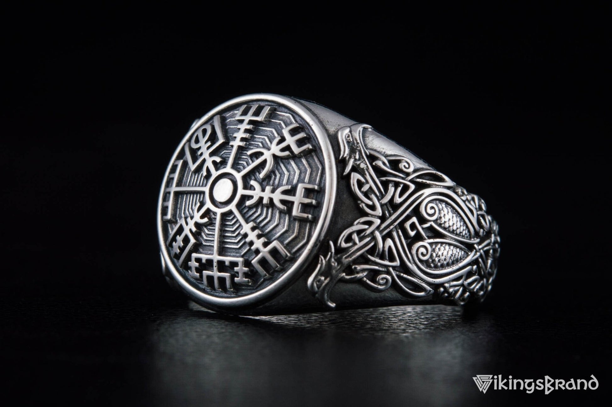 Vegvisir Viking Symbol Ring with Scandinavian Style Ornament Sterling Silver Jewelry