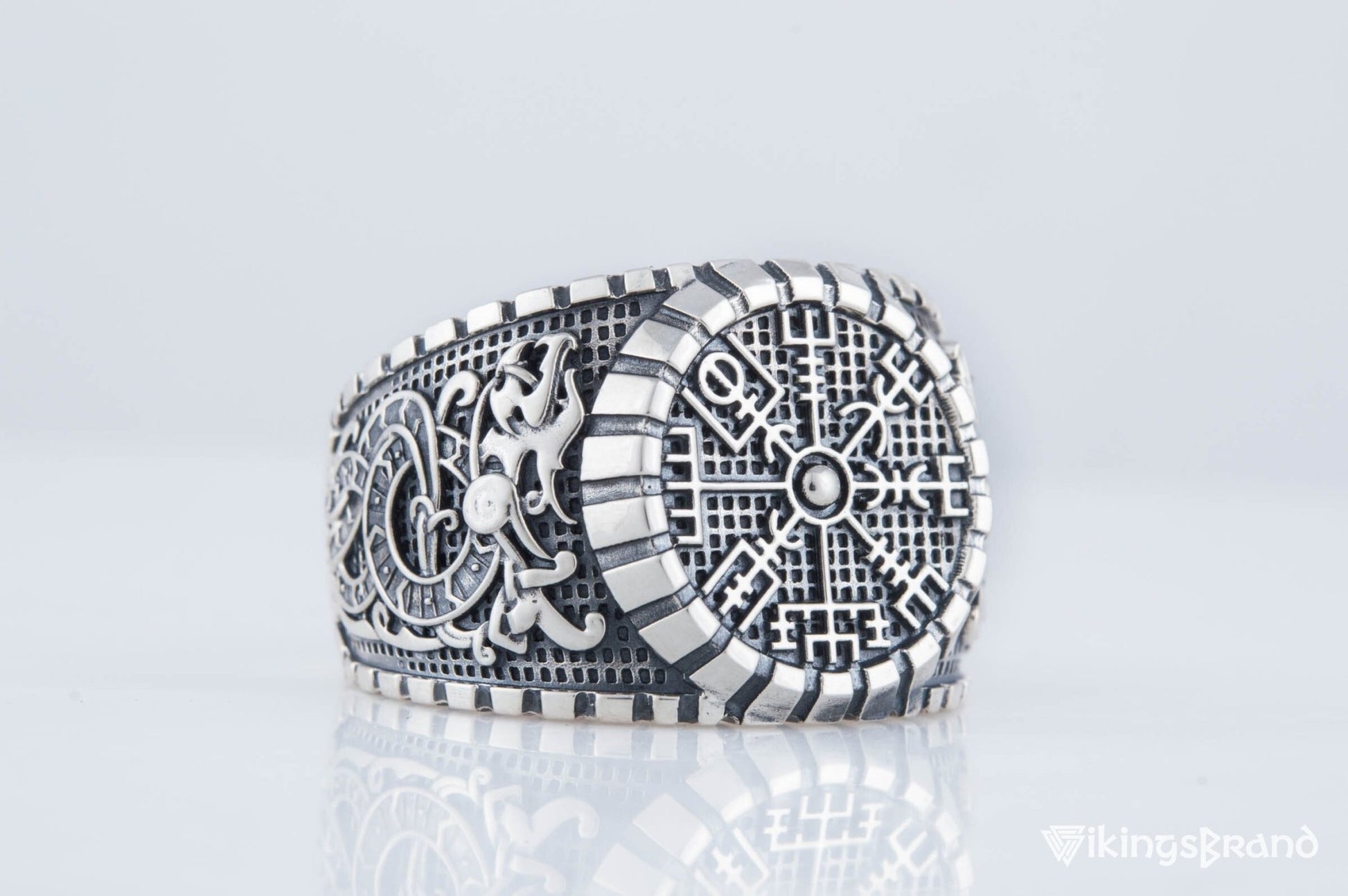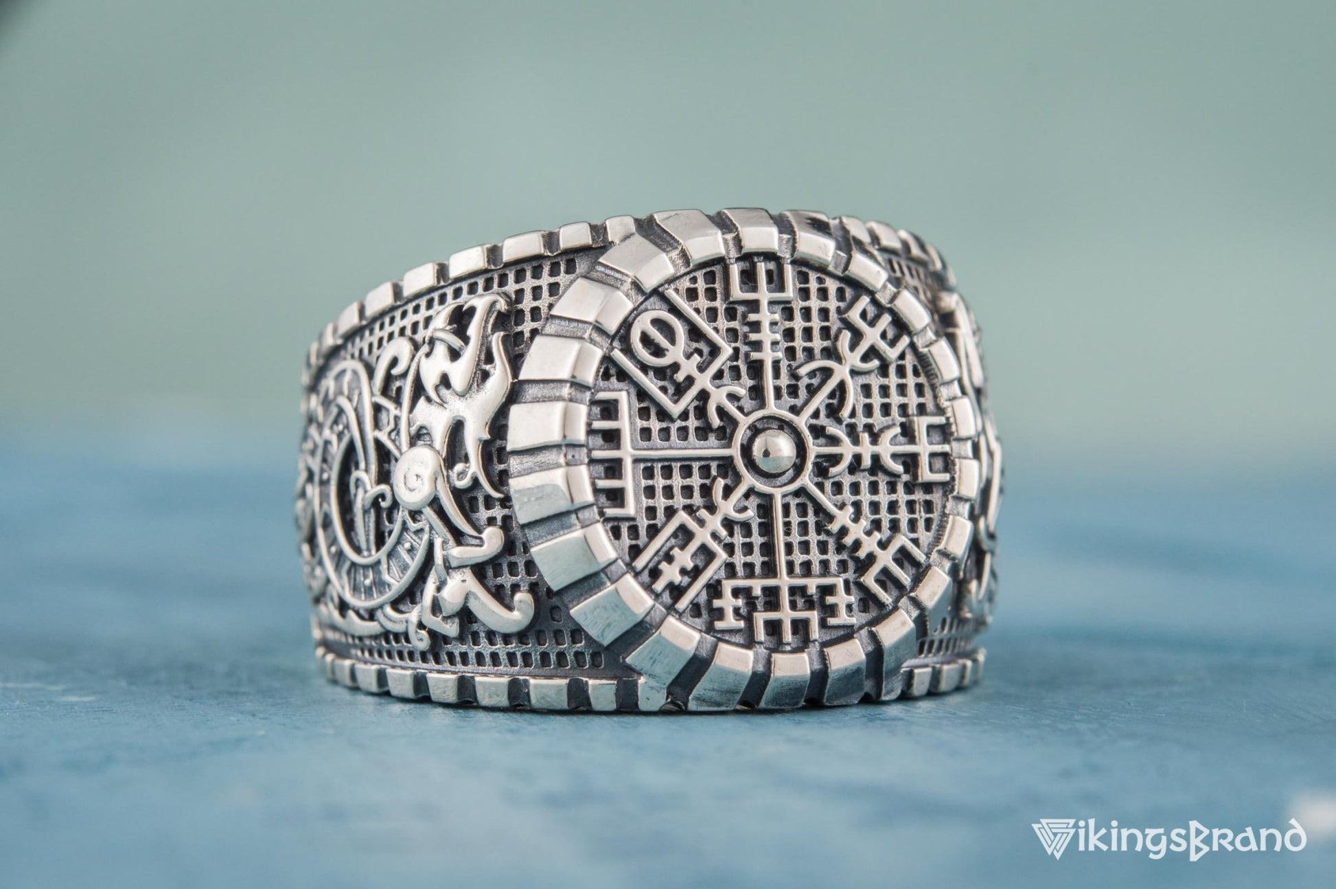 Vegvisir Viking Symbol Ring with Viking Style Ornament Sterling Silver Jewelry