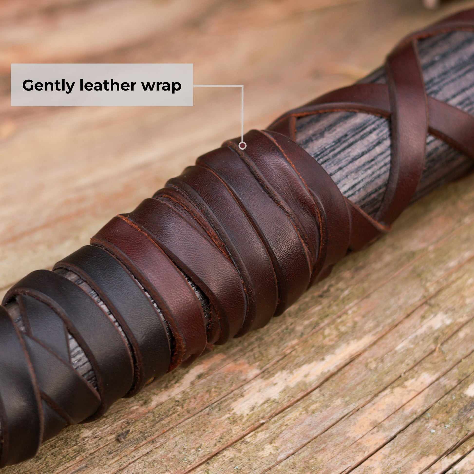 Forged from high-carbon steel W108 and paired with an ash wood handle wrapped in soft leather, this axe provides a secure grip and long-lasting durability. With a hardness rating of 54–58 HRC (Rockwell), it’s ready for both functional use and proud display.