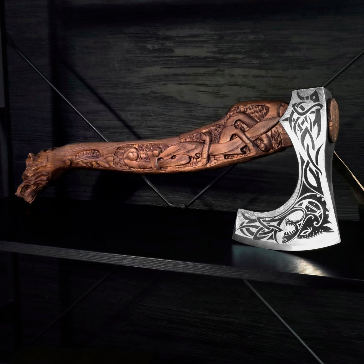 The handle features a hand-carved Fenrir, the legendary wolf from Norse mythology — a symbol of raw power, fate, and freedom from all bounds. This axe is not just a weapon, but a work of art.