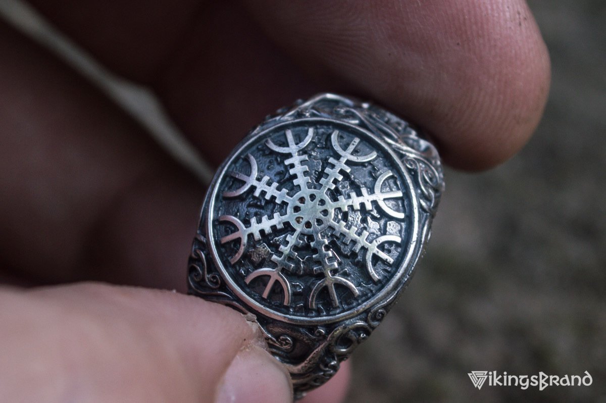 Viking Helm of Awe Symbol with Urnes Viking Style Sterling Silver Norse Ring