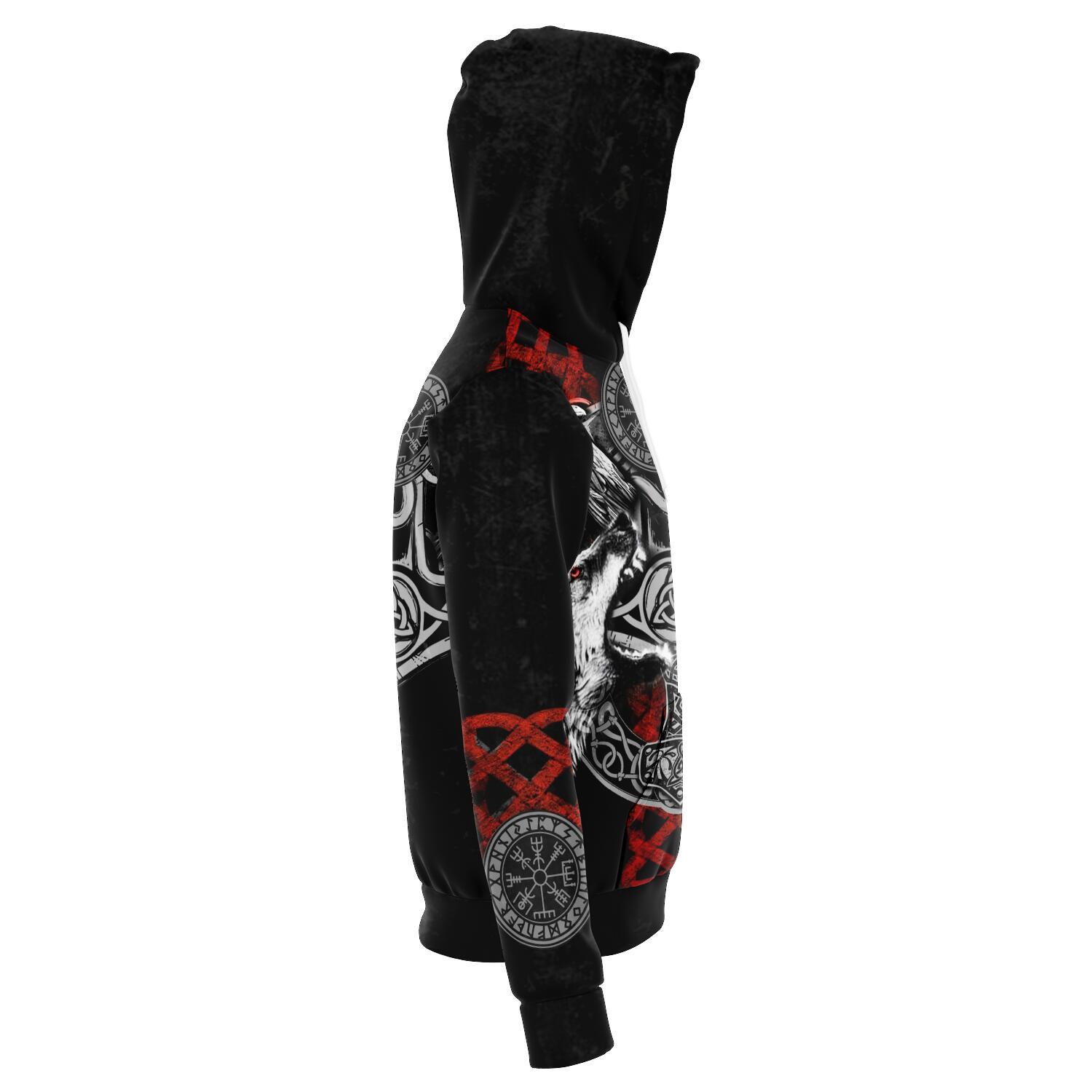 Viking Hoodie with Wolves Geri and Freki, and Ravens Hugin and Muninn.