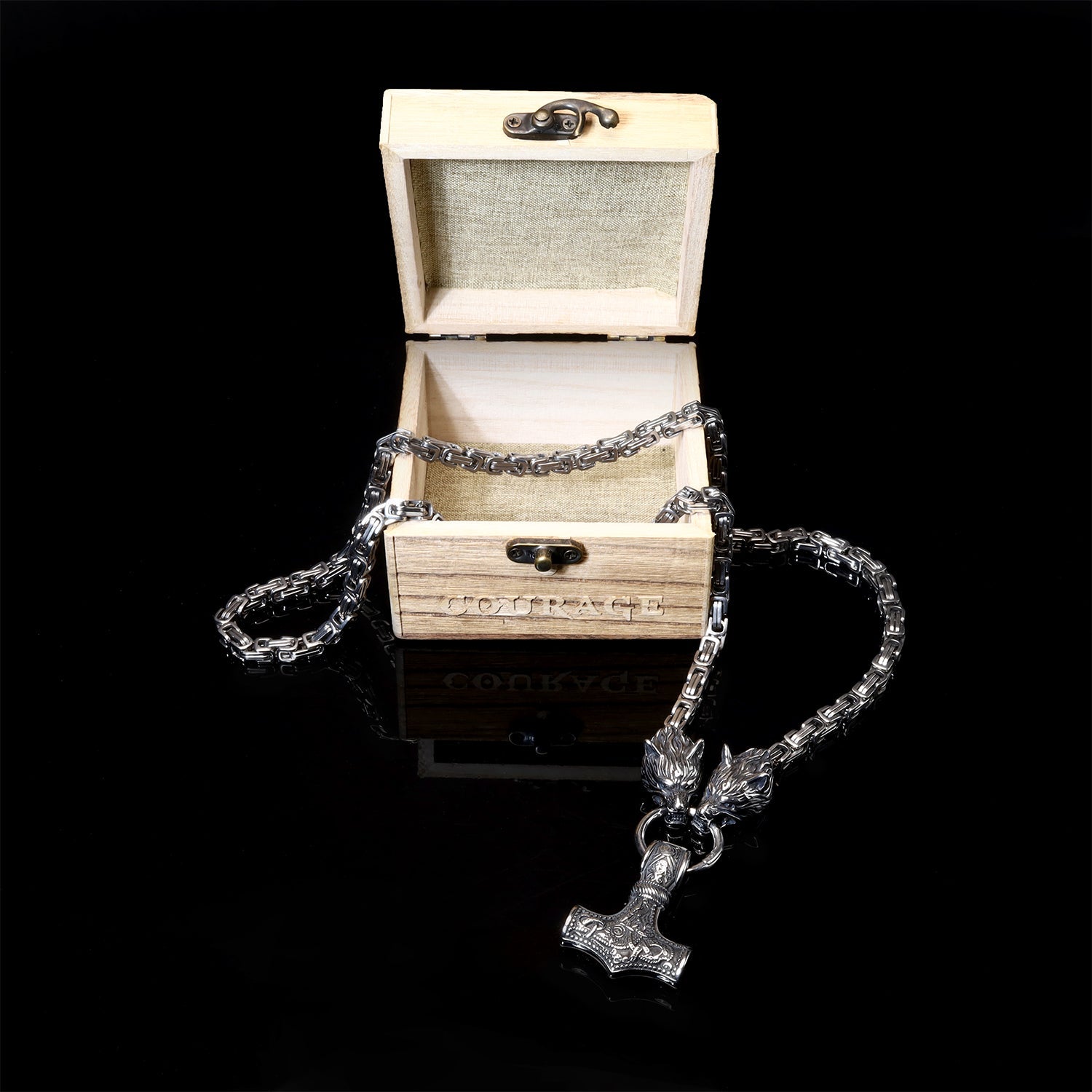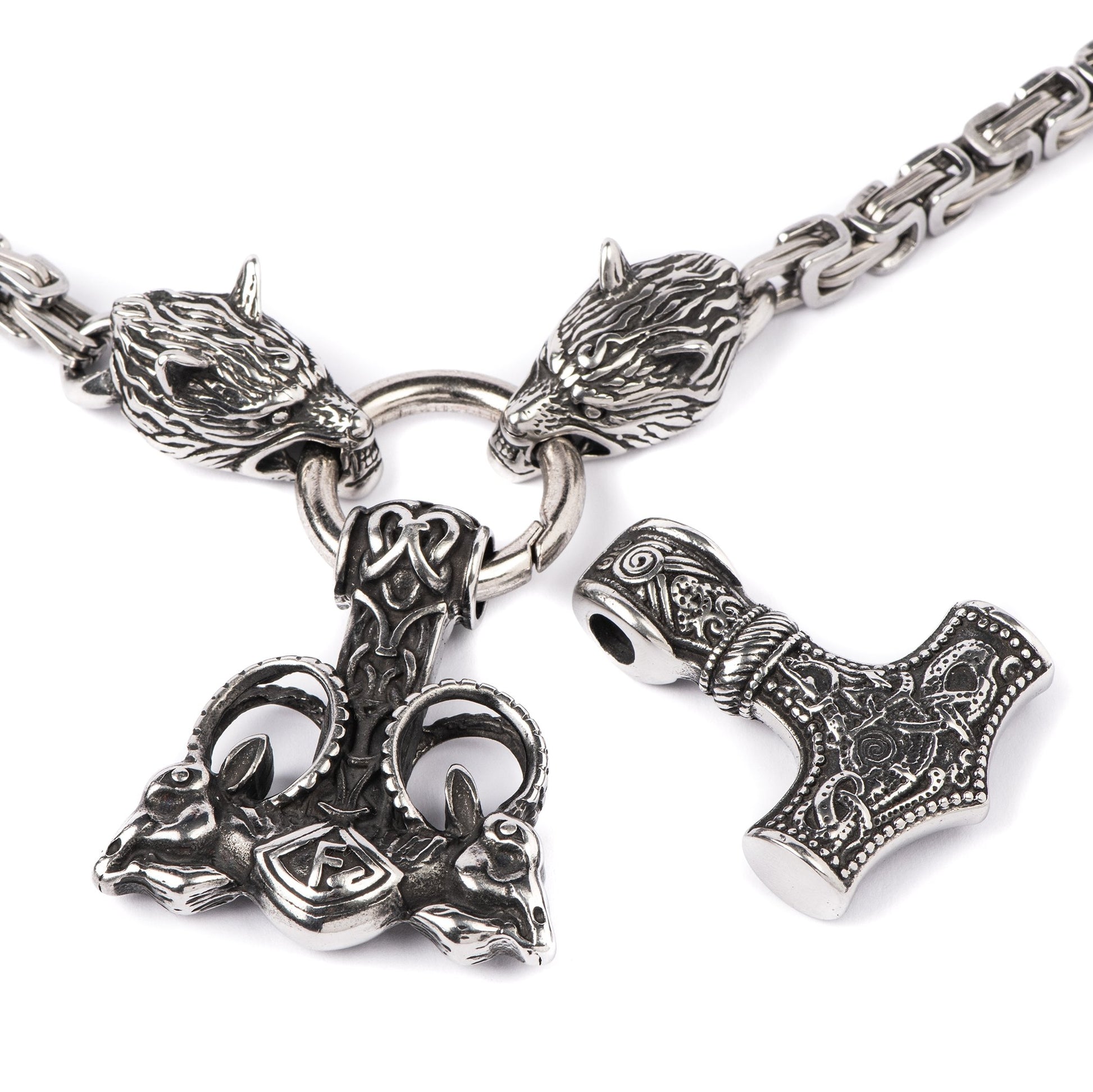 - WHAT YOU NEED: Set of 2 Mjolnirs, Wolf Head Chain Necklace & Carved Wooden Box. Viking jewelry pieces are truly unique, seamlessly combining masterful artistry with images of nature, animals, and mythology. Worn by Vikings as an amulet of protection and power, Thor’s hammer necklace is the perfect jewelry piece for you! This set is prefect Viking Gift for Men!