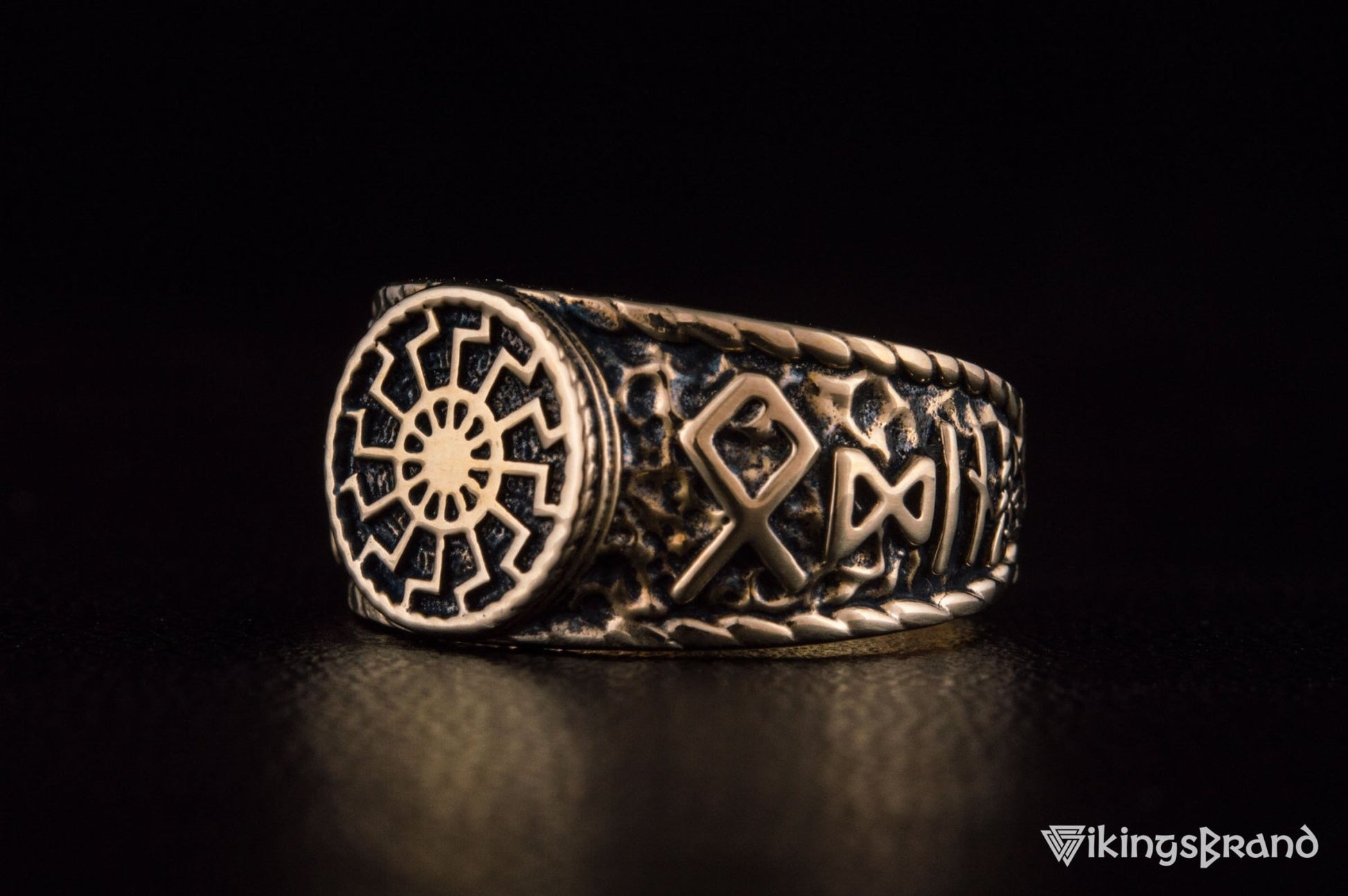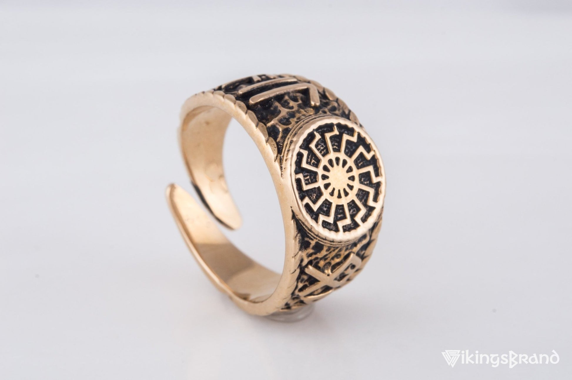 Vikings Black Sun Symbol with HAIL ODIN Runes Bronze Viking Ring