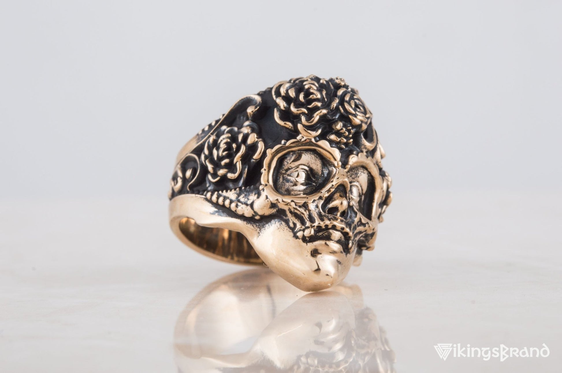 Vikings Mask Ring with Flower Ornament Bronze Unique Handmade Jewelry