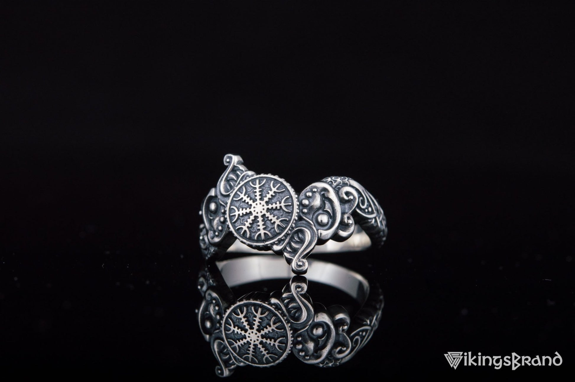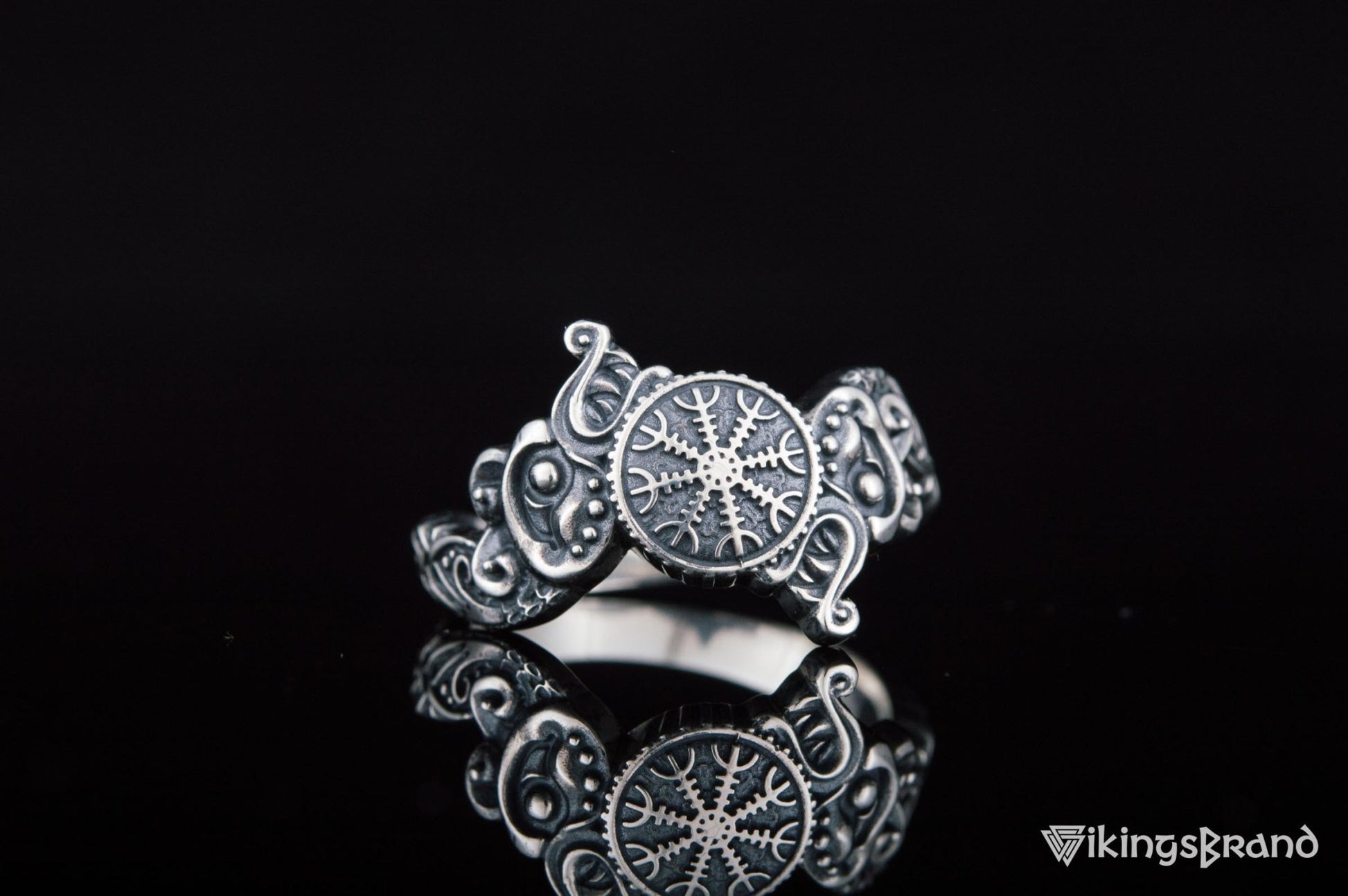Vikings Ring with Helm of Awe Symbol and Wolf Ornament Sterling Silver Viking Jewelry