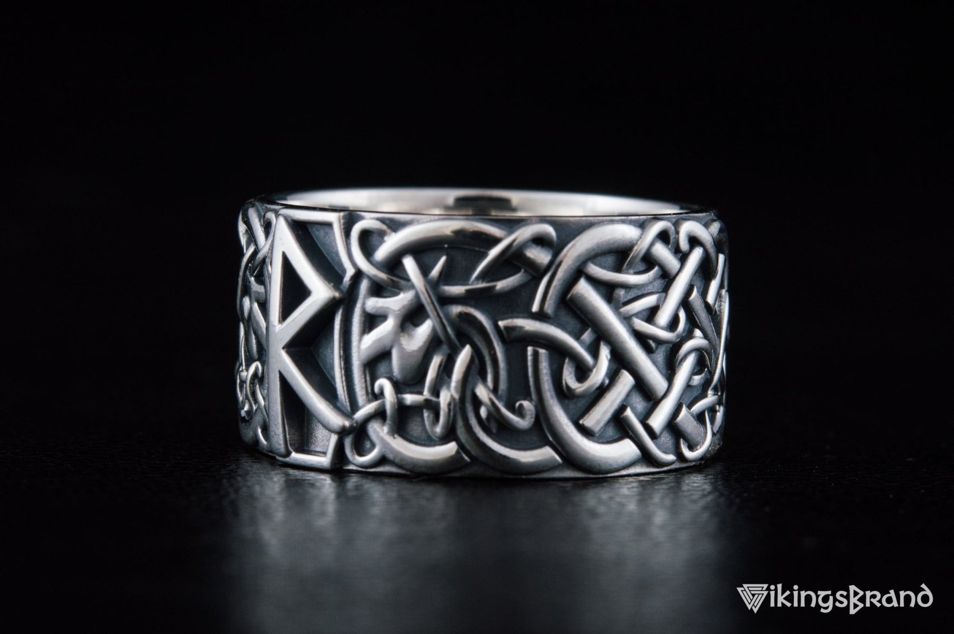Vikings Ring with Raido Rune and Scandinavian Ornament Sterling Silver Viking Jewelry