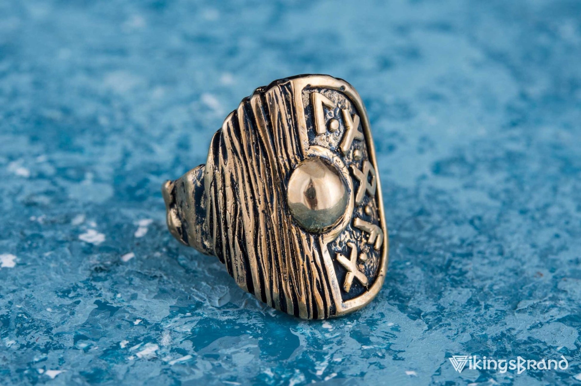 Vikings Shield With Runes and Wooden Texture Bronze Pagan Ring