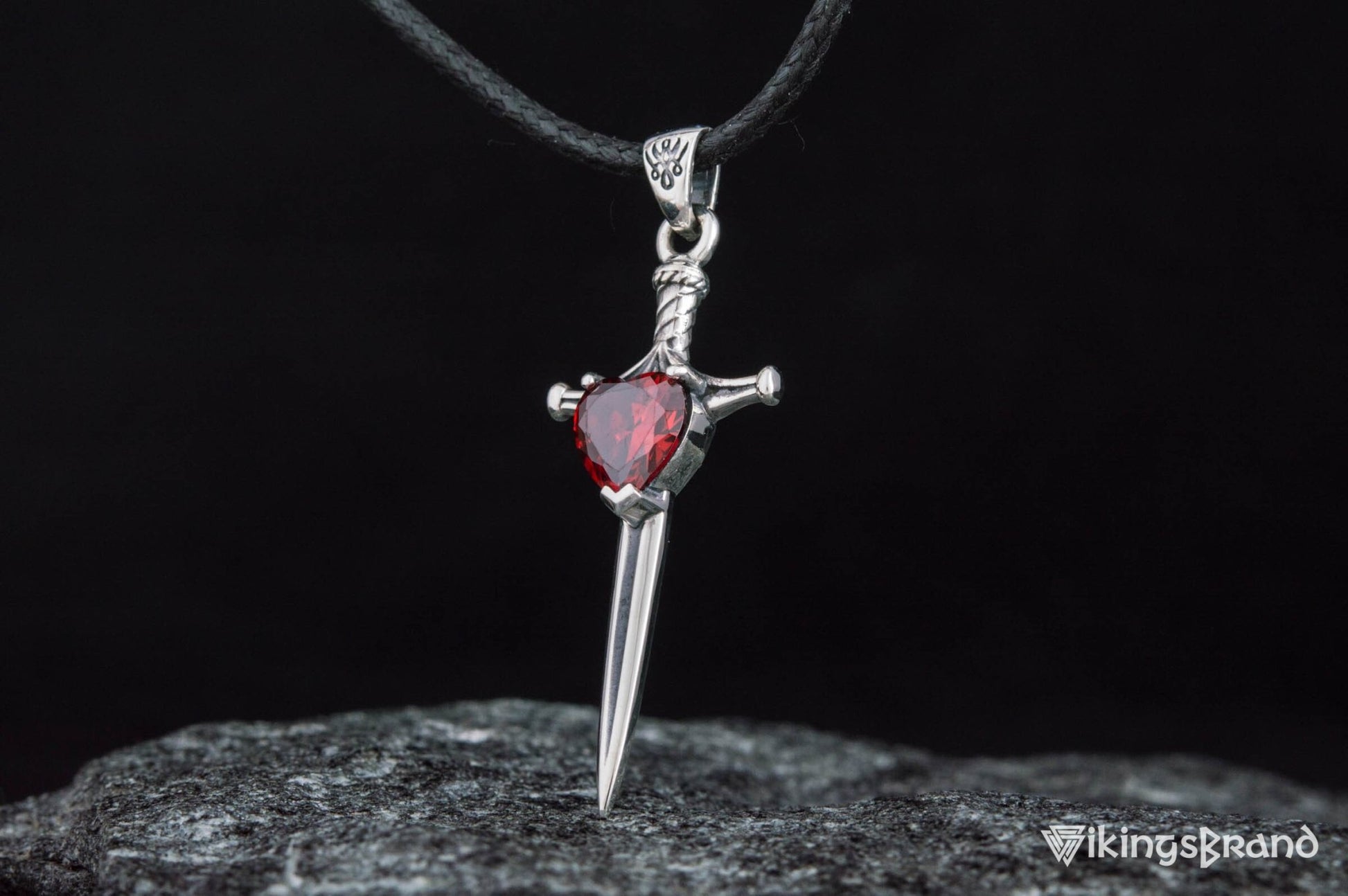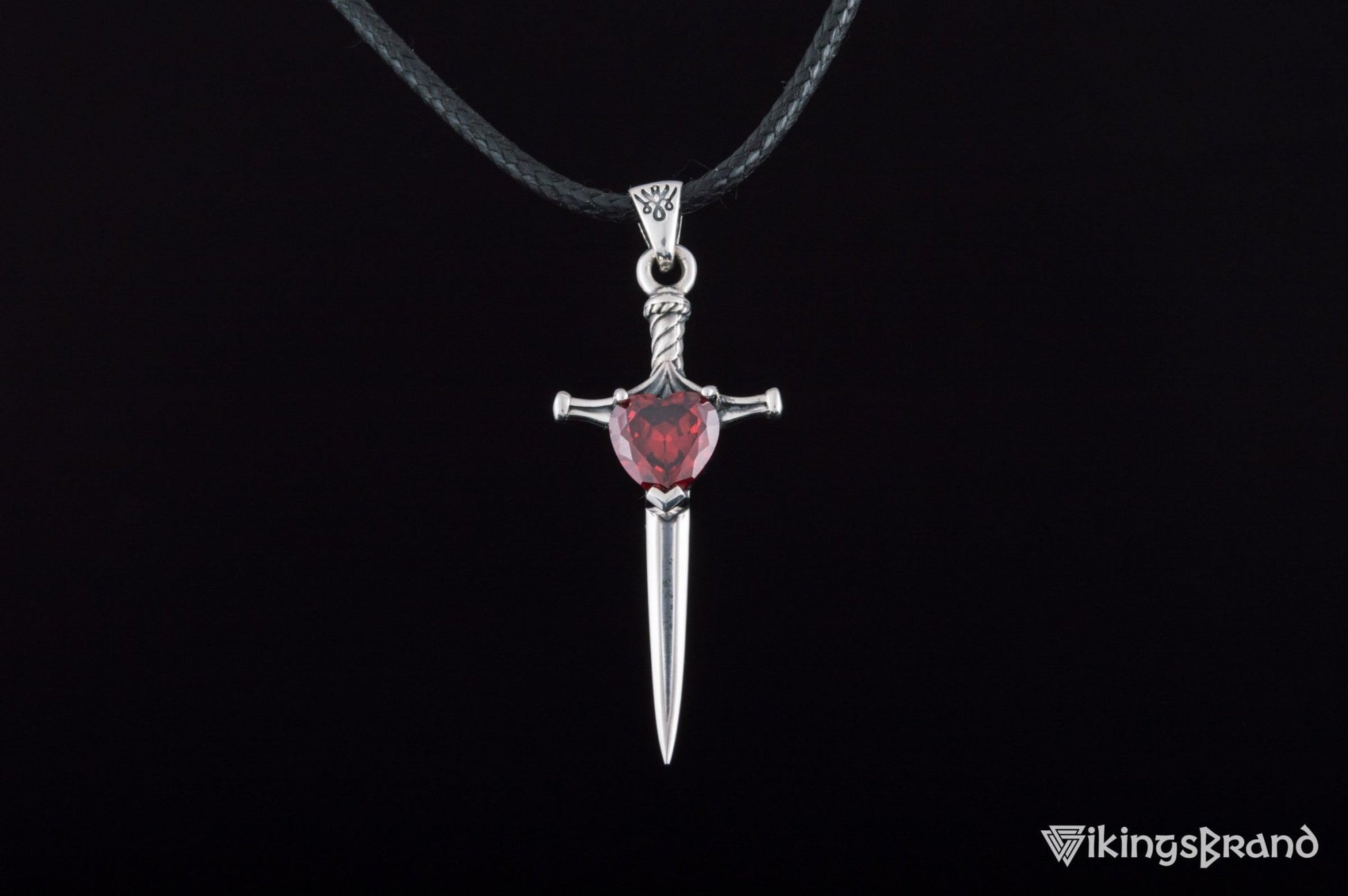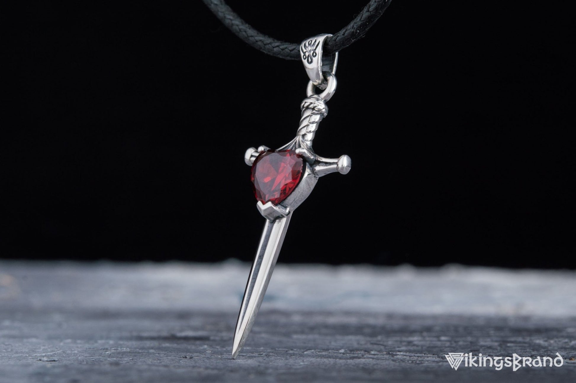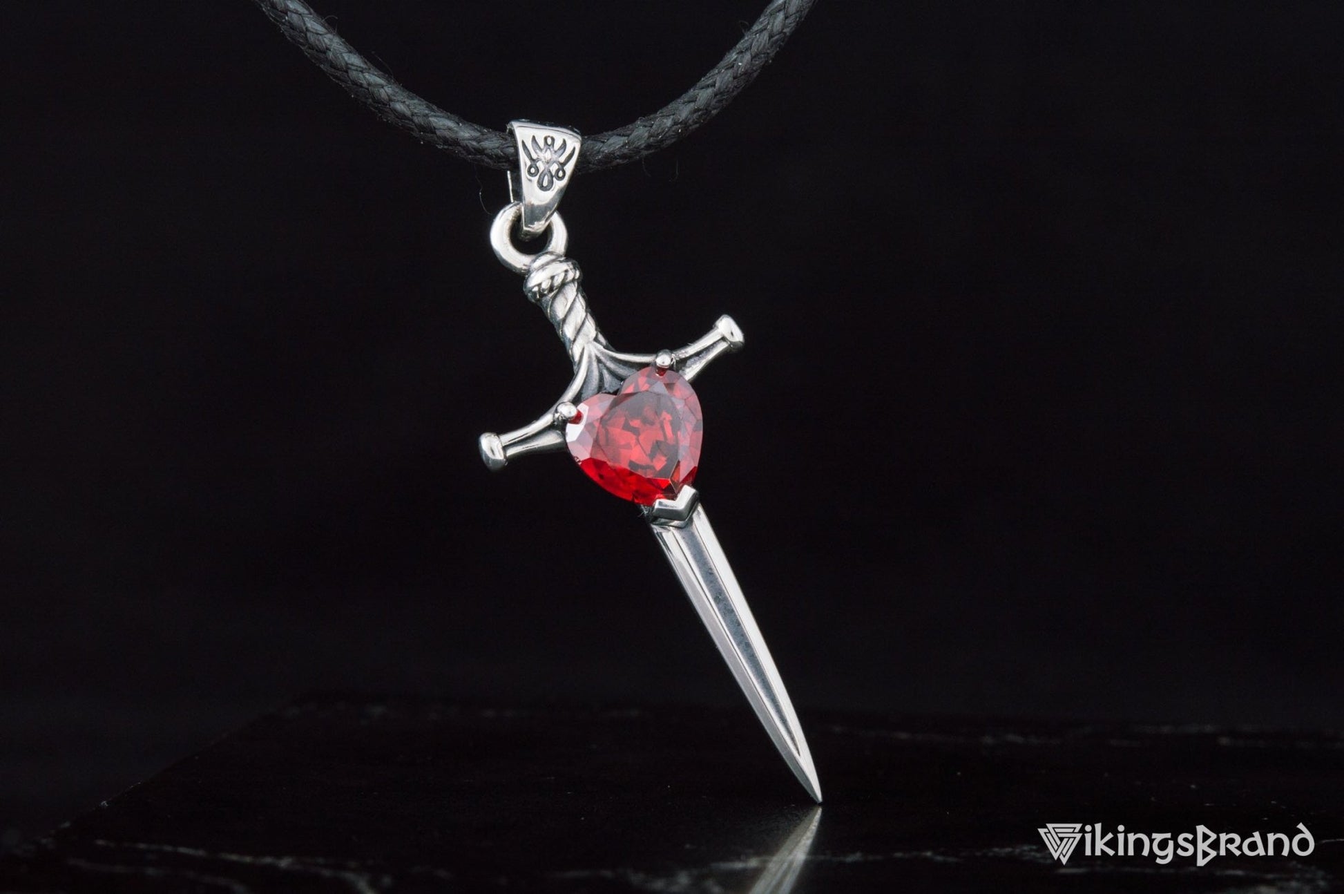 Vikings Stiletto Sword Pendant with Red Cubic Zirconia Sterling Silver Handmade Jewelry