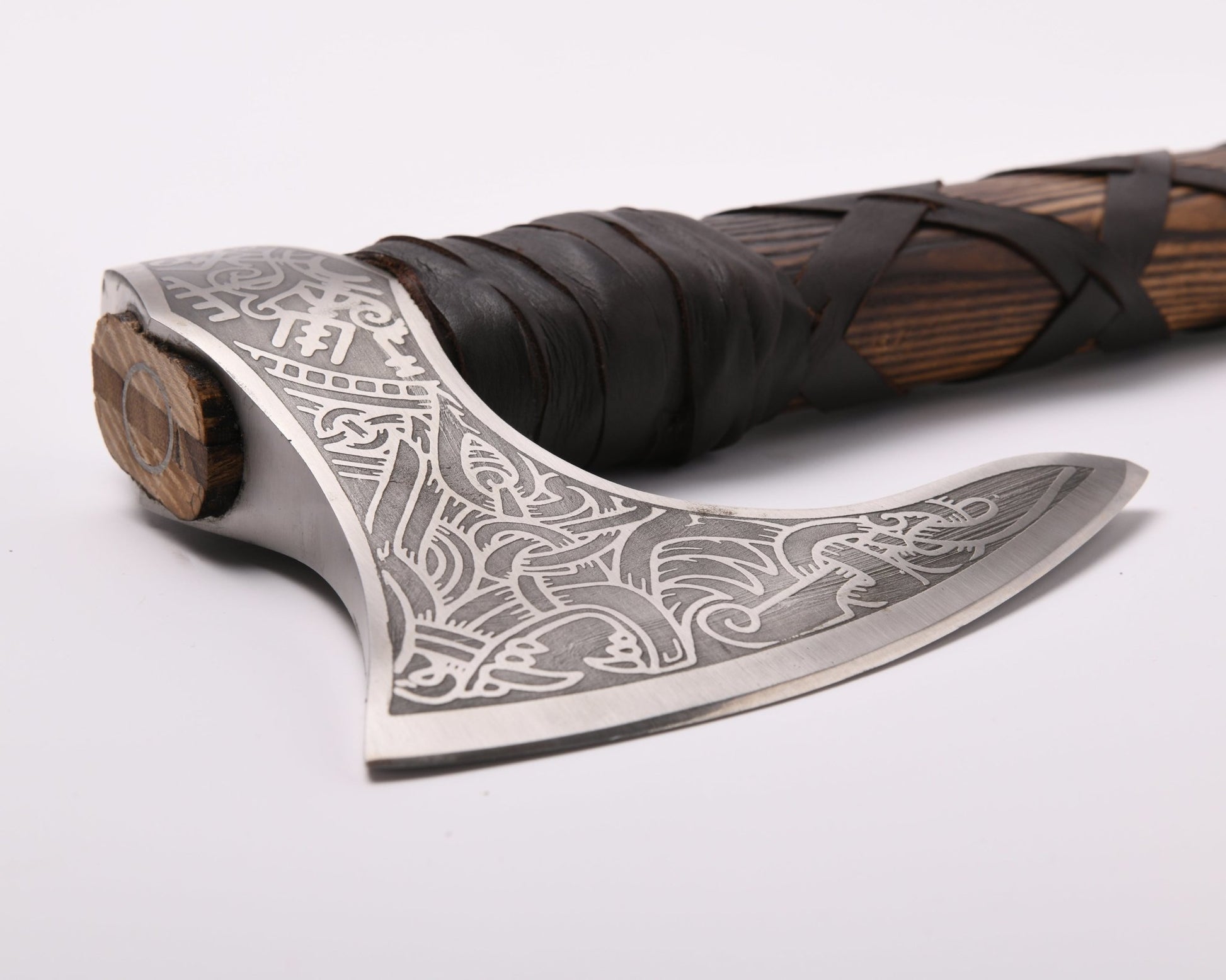 The expertly handcrafted bearded axe head is engraved with images from Norse history and mythology. The butt end features an image of the Icelandic magical stave "Vegvisir," while the blade end is beautifully adorned with a wolf's head — a design that wolf-lovers and fans of Fenrir can’t help but admire.