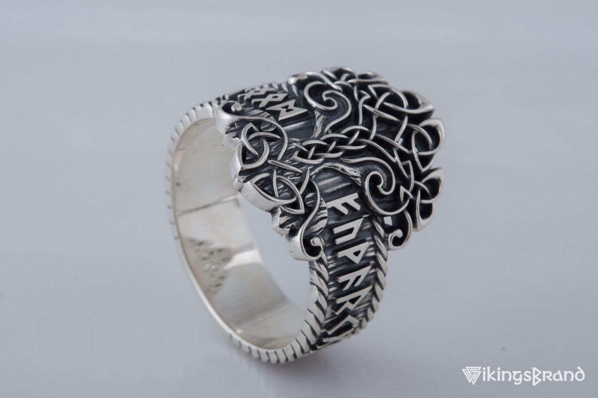 Yggdrasil Viking Symbol Ring with Norse Runes Ornament Sterling Silver Viking Jewelry