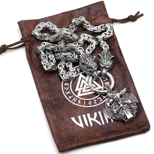 HANDMADE King's Stainless Steel Wolf Head Necklace with Odin Warrior Pendant