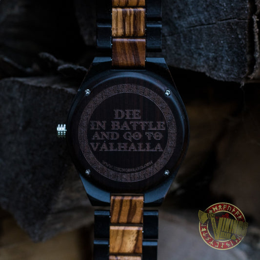 Ivar Viking Wooden Watch with Helm of Awe Viking Symbol & Engraved Die in Battle & Go To Valhalla Saying